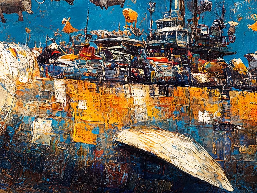 Een vleugje surrealisme, gecombineerd met levendige kleuren en een sterk visueel idee - deze muurschildering neemt je mee op een fantastische reis. Het middelpunt is een gigantisch schip, dat ook de vorm heeft van een enorme haai. Met roestgele tinten en sterke blauwtinten ziet het eruit als iets uit een andere wereld. Op het dek en in de lucht dartelen dieren rond: vliegende koeien, vogels, vissen en andere wezens die het tafereel een humoristisch, bijna droomachtig tintje geven.