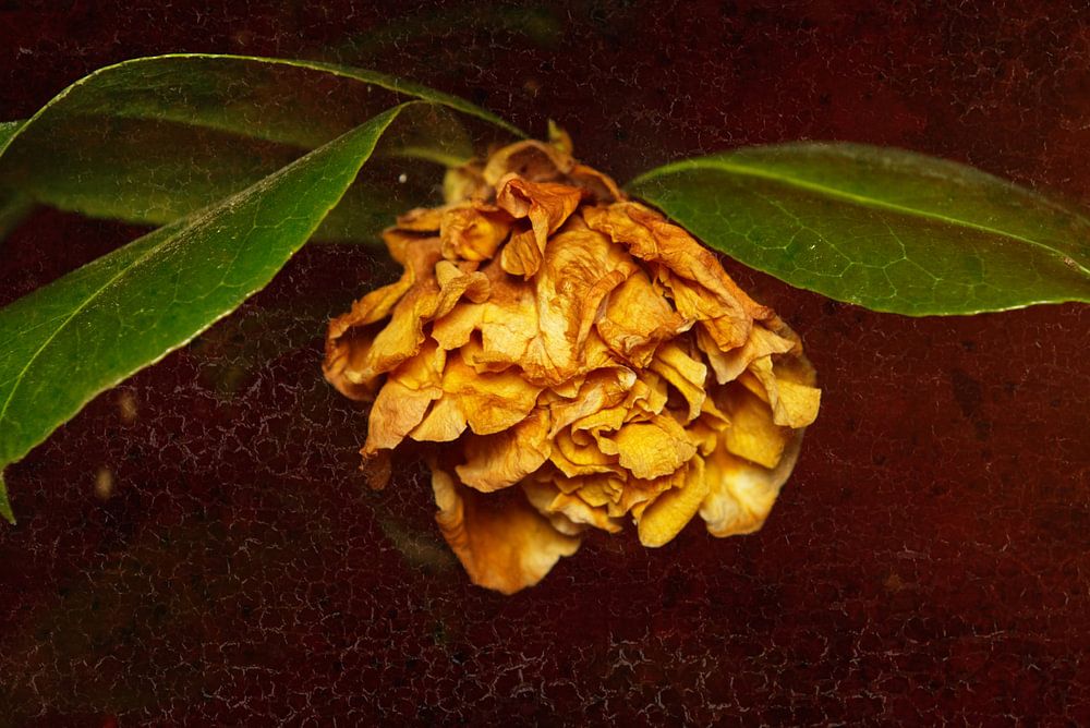 Een macro van een opgedroogde bloem nog aan de plant, met wat extra fantasie