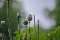 close up van uitgebloeide klaprozen, wat er uit ziet als hoofdjes met kroontjes, met een zachte groene achtergrond