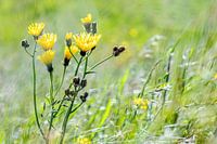 De gele bloemen van bloeiend havikskruid stralen je tegemoet op een winderige dag in de lente. Deze gele bloemetjes maken me altijd vrolijk.