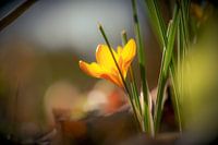 zachte macro van een enkele gele krokus in het ochtendlicht met bokeh achtergrond