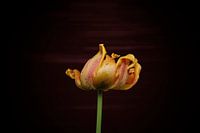 Koop dit bloemen kunstwerk gele tulp aan het eind van haar bloei met subtiele achtergrond van Ribbi op canvas, aluminium dibond, (ingelijste) fotoprint, behang en ArtFrame, op maat geprint in Fine-Art kwaliteit.