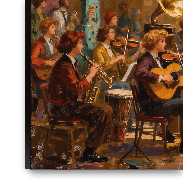 Dit expressieve schilderij toont een levendige muzikale scène, omgeven door een ruimte vol fantasie, creativiteit en warm, gouden licht. Een groep muzikanten zit in het midden van de compositie en speelt samen in een geïmproviseerd ensemble van klassieke en moderne instrumenten, waaronder viool, gitaar, piano, saxofoon en contrabas. De…