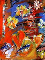 Een kleurrijk en expressief bloemenschilderij voor de woonruimte. Het straalt optimisme en vrolijkheid uit. De schoonheid van de natuur biedt altijd onuitputtelijke bronnen van inspiratie. Bloemenfantasieën worden kunstig in scène gezet...bloemen, bloesems en hartjes brengen een goed humeur aan de muur....