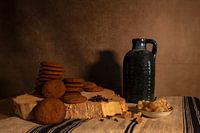 een stilleven van een tafel met vers gebakken gemberkoeken met kruidnagel en geconfijte gember op een houten plank