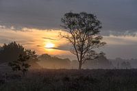 landschap op de Wolfhezerheide op een mistige morgen, waar de zonsopkomst door de gesluierde wolken schijnt