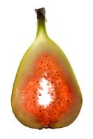 Een dun schijfje van een vijg toont het innerlijke leven van deze exotische vrucht in doorvallend licht.