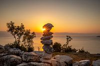 Cairn op de zee op een heuvel bij Bresc in Kroatië. de zon komt net op en breekt in de stenen. Mooi gestapeld op een muur