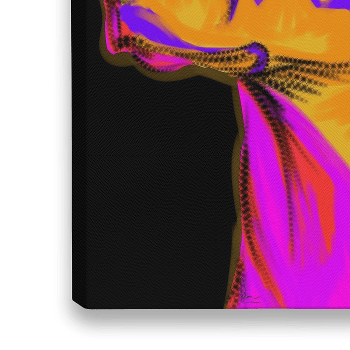 Dit is een levendige digitale illustratie van een hondenportret, met een zeer gestileerd kleurenpalet dat de unieke aanpak van de kunstenaar' definieert. Het kunstwerk verwerpt het traditionele realisme en gebruikt dynamische, intense kleuren zoals elektrisch oranje, gloeiend magenta en rijk paars om energie en persoonlijkheid over te brengen. Het effect is een pakkende, expressionistische studie die de waakzame geest en alertheid van de hond vastlegt, waardoor een eenvoudig portret verandert in een gedurfde uitspraak over kleur, emotie en stijl.