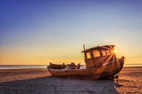 Oud glanst - een gestrande vissersboot versiert zich met de rijzende zon.