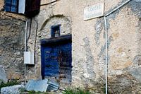 Rommelige gevel met blauwe deur in de gemeente Fouillousse in de Haute-Alpes in het zuiden van Frankrijk.