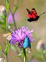 Drie verschillende vlinders op paarse bloem, macrofoto