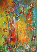 Bloembeeld in acrylverf en grafische elementen. Een kleurrijk en expressief beeld voor de woonkamer. Het straalt optimisme en sereniteit uit. bloemen, bloesems, bladeren en bloesems