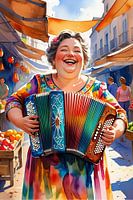 Koop dit digital art kunstwerk gezellige dame speelt accordeon op straat van De gezellige Dames als reproductie op canvas, aluminium dibond, (ingelijste) fotoprint, behang en ArtFrame, op maat geprint in Fine-Art kwaliteit.