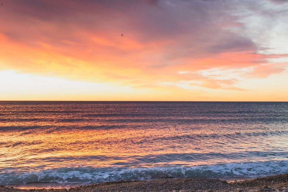 Een zonsopkomst met een strand van kleurrijke stenen aan de middellandse zee