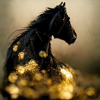 Een prachtig zwart paard gemaakt met AI die bedenkt is met bladgoud en gouden glitter. De kleurencombinatie geeft een luxe uitstraling en heeft warme tinten. Het geeft een interessant beeld omdat het paard weg kijkt.