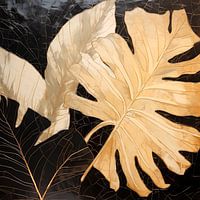 De bladeren lijken bijna te zweven in de lucht, alsof ze losgekomen zijn van een tropische boom of plant. De compositie is dynamisch en aantrekkelijk, en trekt de aandacht van de kijker.