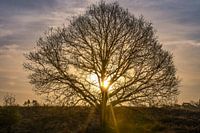 landschap met een grote boom, waar de opkomende zon als een ster tussen de takken schijnt