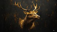 In de verte, bij een rustige, spiegelende zwarte meer, staat een gouden hert aan de waterkant.