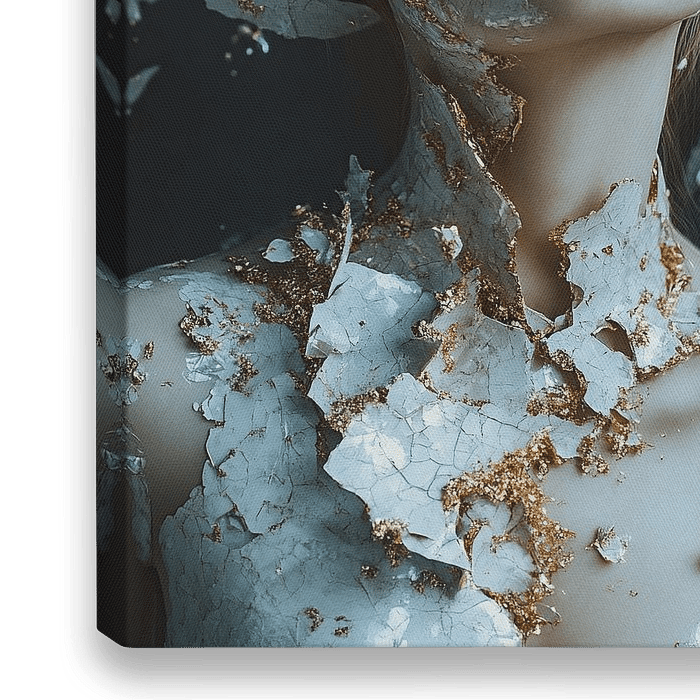 Een witte sculptuur van het lichaam met gouden scheuren, gebroken en gerepareerd door goud materiaal, een mooie vrouw's gezicht met gesloten ogen, witte huidskleur en perfecte gelaatstrekken, een zwarte achtergrond, en de voorste helft is afgebroken.