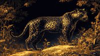 Een gouden panter sluipt sierlijk door het bos, zijn gespierde lichaam glanzend en reflecterend als vloeibaar goud.