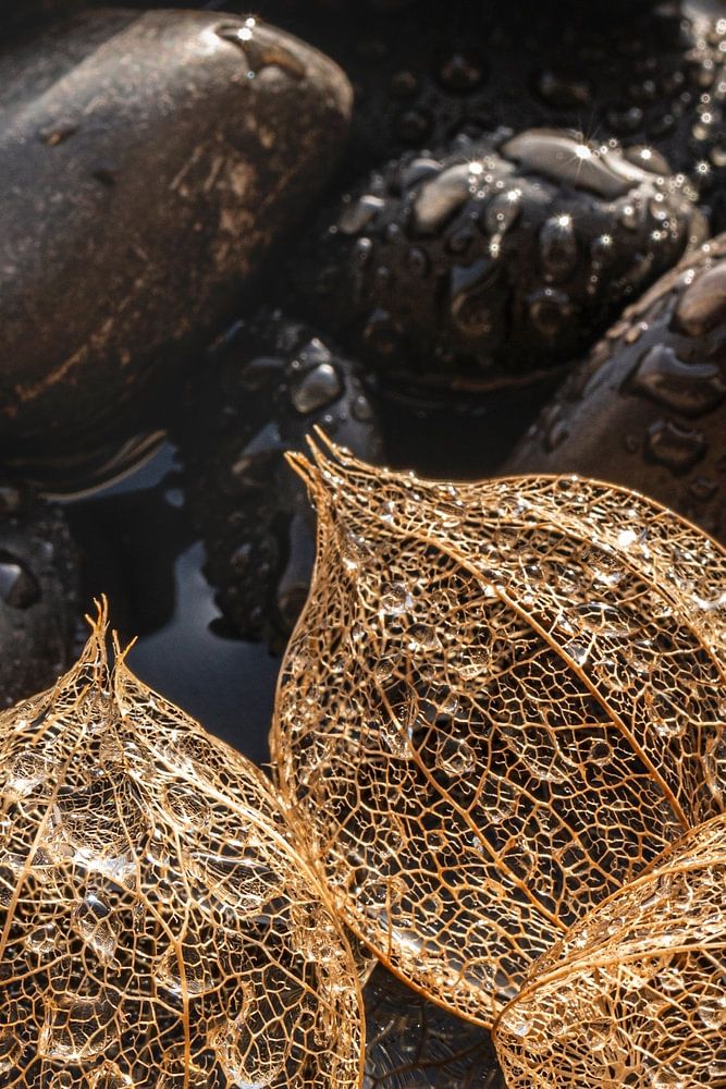 Physalis omhulsels op stenen met waterdruppels