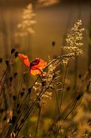 zonsondergang tijdens het gouden uur in de wei met een enkele klaproos tussen het graan en verschillende grassoorten met prachtig tegenlicht.