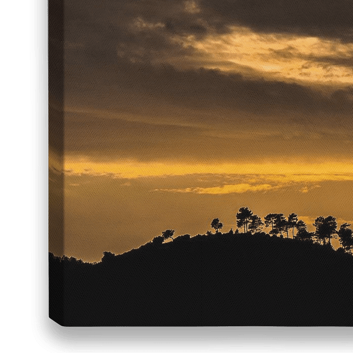Deze foto is gemaakt in La Garde Freinet, een plaatsje in de bergen in Zuid Frankrijk, vlakbij Grimaud en St. Tropez. De zon zakt langzaam achter de bergkam en veroorzaakt een gouden gloed. Hier en daar peren wat zonnestralen nog door het wolkendek.
