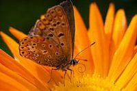 De kleuren van het blauwtje worden een beetje overstraald door de felle goudsbloem kleuren.