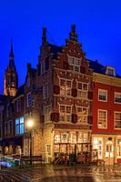 grachtenpand in Delft bij schemer met de toren van de Nieuwe Kerk in de achtergrond; Delft, Nederland