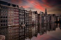 prachtige wolkenlucht achter de karakteristieke grachtenpanden aan het Damrak in Amsterdam en hun spiegeling in het water