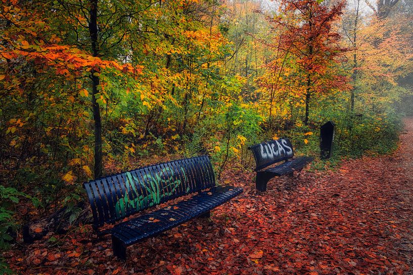 Koop de foto graffiti bankjes in de herfst van peterheinspictures als print op canvas, aluminium dibond, (ingelijste) fotoprint, behang en ArtFrame. Voor jou op maat geprint in Fine-Art kwaliteit.