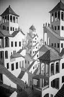 digitale fictieve Escherachtige pentekening afbeelding van huizen en trappen