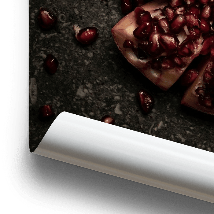 Een open gesneden granaatappel, waar de eetbare pitjes goed zichtbaar zijn. Rondom de granaatappel liggen losse pitjes verspreid. Een lust voor het oog en het water loopt je in de mond. Een ware aanwinst voor aan je muur.