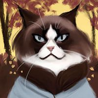 Digitaal portret van een grappige en mooie Ragdoll kat met blauwe ogen en een jas aan.