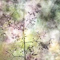 Een sierlijk, fragiel grasje anders bekeken. Je ziet de fijne, tere, vertakte stengel van een grassoort. Door de geringe scherptediepte is de achtergrond wazig geworden. Gras en bloemen zorgen voor de verschillende kleurvlakken. Door digitale bewerking zijn contrasten en accenten versterkt en de kleuren veranderd.