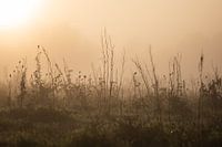 wilde grassen die in een mistig landschap staan, met de rijzende zon in de achtergrond