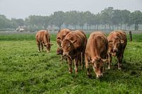 koeien grazen in de wei. ze vormen een kringetje ter bescherming van een kalf.