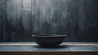 Een donkergrijze, brede, ondiepe kom staat op een donkergrijs stenen oppervlak voor een donkergrijze, verticaal gepaneelde muur. De scène is minimalistisch en monochroom.