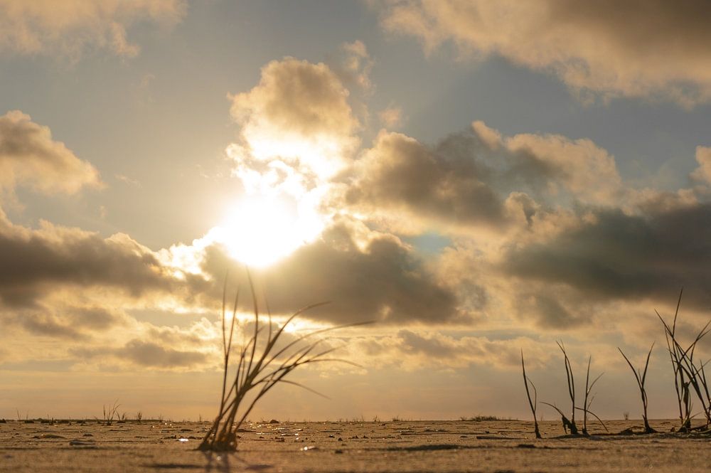 Grassprieten op het strand bij een zonsondergang met prachtige wolken. Zon centraal met wolken tegen een blauwe lucht vanuit een laag perspectief zodat de grassprieten het focus punt worden