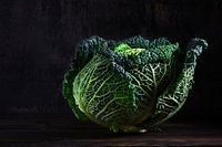 groene savooiekool, een gezonde wintergroente in dramatisch licht op donker en humeurig rustiek hout met kopieerruimte, geselecteerde focus