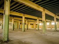 grote gele ruimte met verschillende metalen pilaren gekleurd in groen en geel