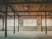 een grote ruimte met veel ramen en pilaren, op een verlaten locatie