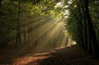 Zonlicht reflecteert op de vochtige lucht in beuken bos. Hierdoor ontstaat een zonneharp, zonnestralen die vanuit een 'spotlight' lijken te komen. De laan van beukenbomen behoort bij landgoed Neijenburg te Heiloo. Opname van Oktober 2021.