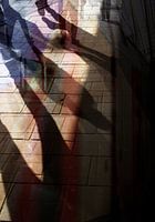fotomontage van verschillende opnames van schaduwen van treinreizigers die zich haasten naar de uitgang van het station of naar de aansluitende trein op het perron van Roermond