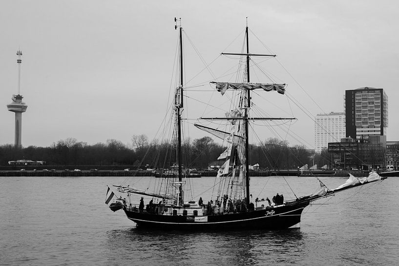 oude zeilschepen varen voorbij op de maas, richting de erasmusbrug