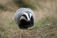 Europese das ( Meles meles ), volwassen dier, lopend over een typisch dassenpad, komt dichterbij, frontale opname, Europa.