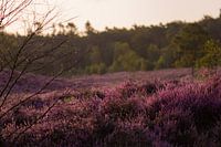 bloeiend heidelandschap in het gouden licht van de opkomende zon