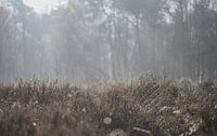 close up van de heidebegroeiing, die fonkelt in de ochtendzon, met op de achtergrond de zonnestralen door de nevel heen
