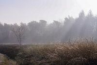 landschap met op de voorgrond schitterende heideplanten, en met op de achtergrond bomen en een mistige lucht waar zonnestralen door schijnen